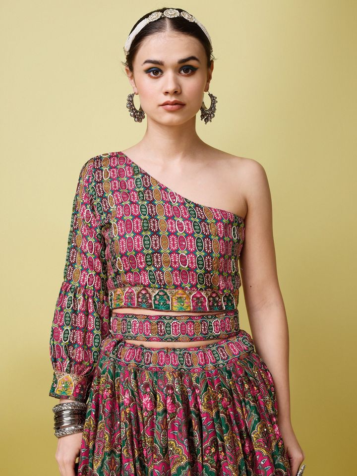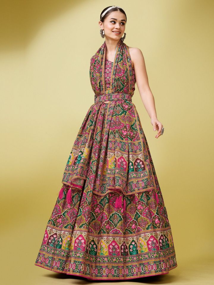Set Includes: Semi-stitched lehenga, unstitched blouse, dupatta, and accessories (Set of 5)