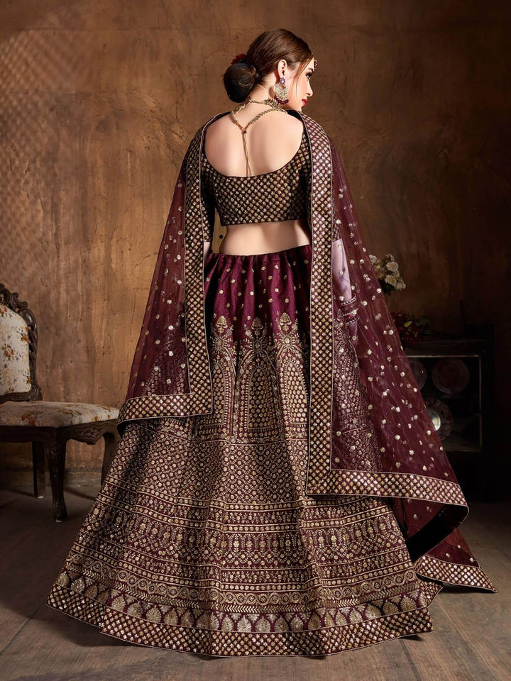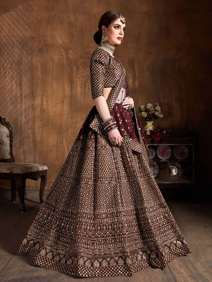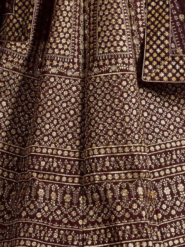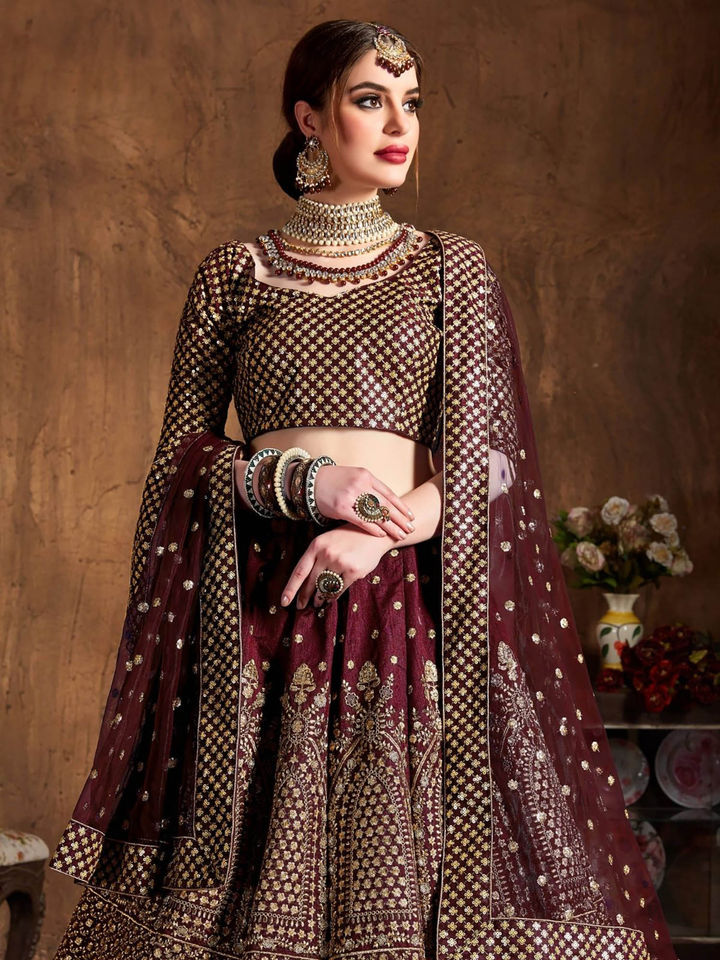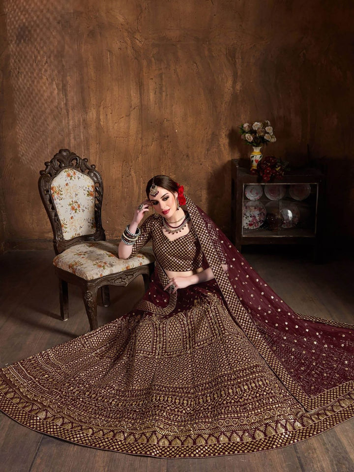 - Add a regal touch to your ethnic wardrobe with this Maroon and Gold Embroidered Semi-Stitched Lehenga Set. Featuring rich zari and thread embroidery, this elegant ensemble includes a semi-stitched lehenga, an unstitched blouse, and a matching dupatta, giving you the perfect blend of luxury and tradition.