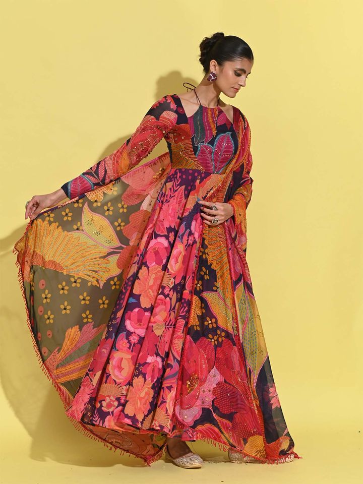Make a bold and vibrant statement with this multicolor abstract floral Anarkali set, designed for the modern woman who loves to blend tradition with contemporary fashion. Crafted from premium georgette fabric, this flowy Anarkali features a stunning mix of floral and leaf motifs in rich hues of pink, orange, purple, and teal, creating an artistic and eye-catching appeal.