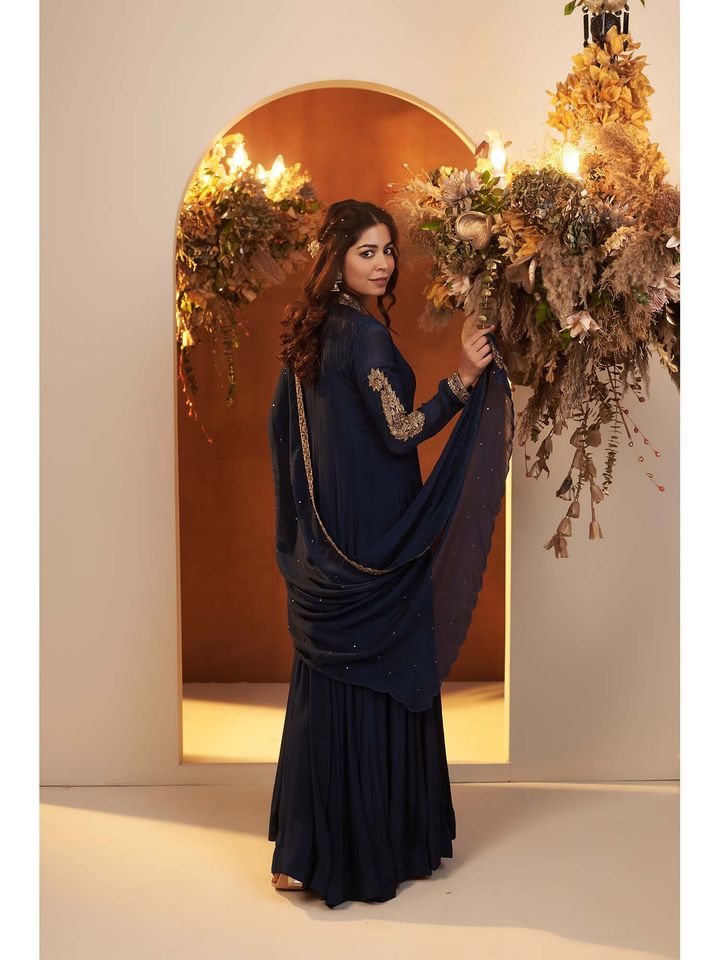 Drape yourself in timeless elegance with this Midnight Blue Anarkali Set, crafted from rich georgette fabric and adorned with delicate gold zari embroidery on the neckline, sleeves, and dupatta border. The full-length flared silhouette offers a regal charm, while the matching dupatta adds a graceful finish. Ideal for weddings, festive occasions, or evening celebrations.