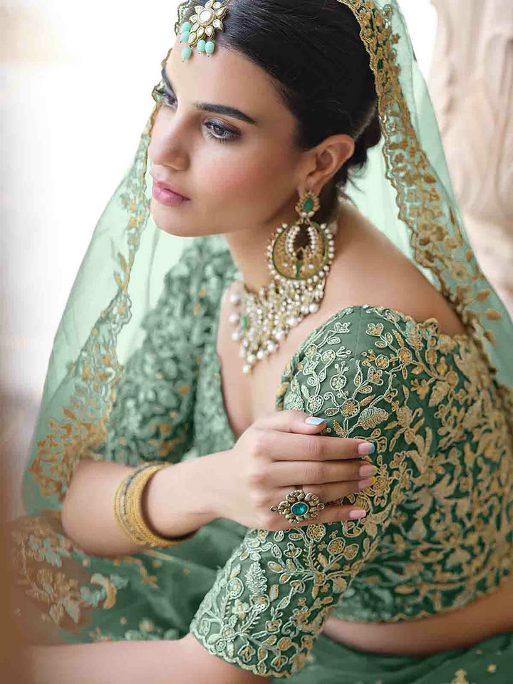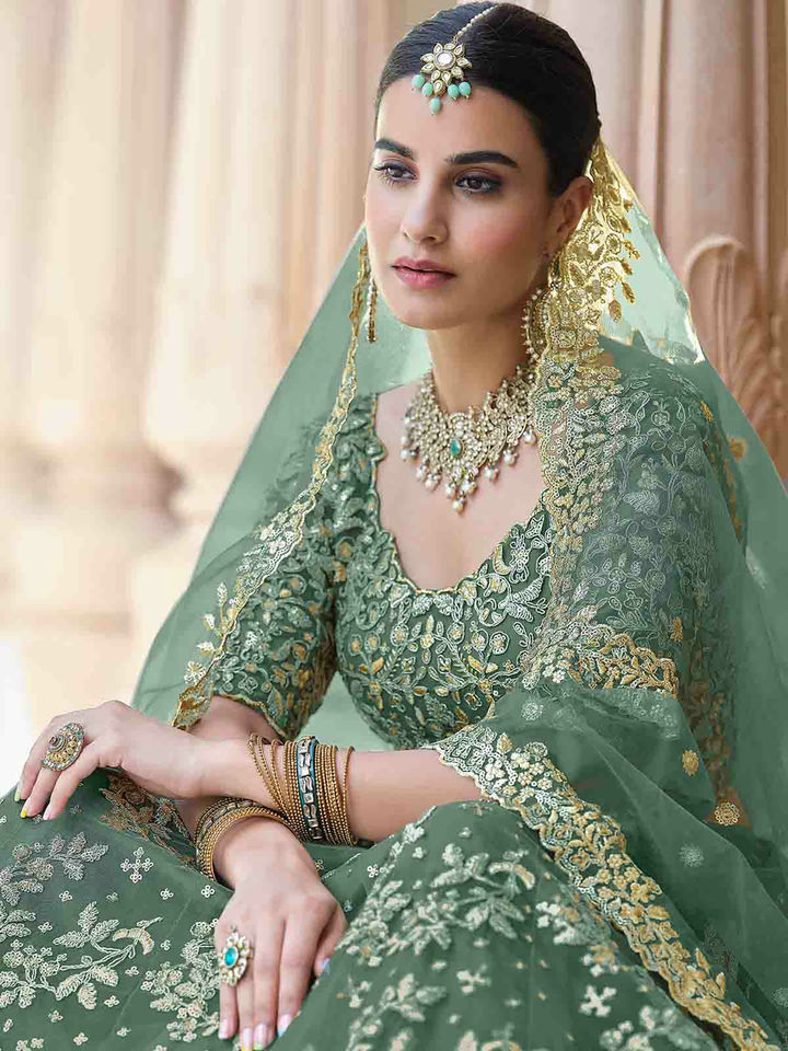 Stylish Dark Green Soft Net Semi Stitched Lehenga with Unstitched Blouse (Set of 3)Add a regal charm to your ethnic look with this Stylish Dark Green Soft Net Lehenga Set. Crafted with precision, the semi-stitched lehenga features intricate embroidery and sequin detailing that beautifully complements its rich color. The soft net fabric ensures a graceful drape, while the unstitched blouse lets you customize the fit and design to your preference. Complete with a matching dupatta, this ensemble is perfect for weddings, festive celebrations, or traditional gatherings. Specifications: Color: Dark Green Fabric: Soft Net Set Includes: Lehenga, Unstitched Blouse, and Dupatta (3 pieces) Work: Embroidery and Sequin Detailing Lehenga Type: Semi-Stitched (Customizable up to 42 inches waist) Occasion: Wedding, Festive, Party Wear Care Instructions: Dry Clean Only Style Tip: Pair it with statement jewelry and embellished heels for an effortlessly elegant look.