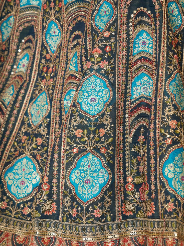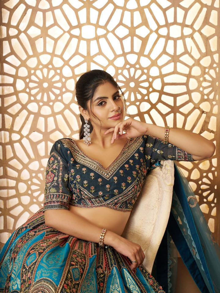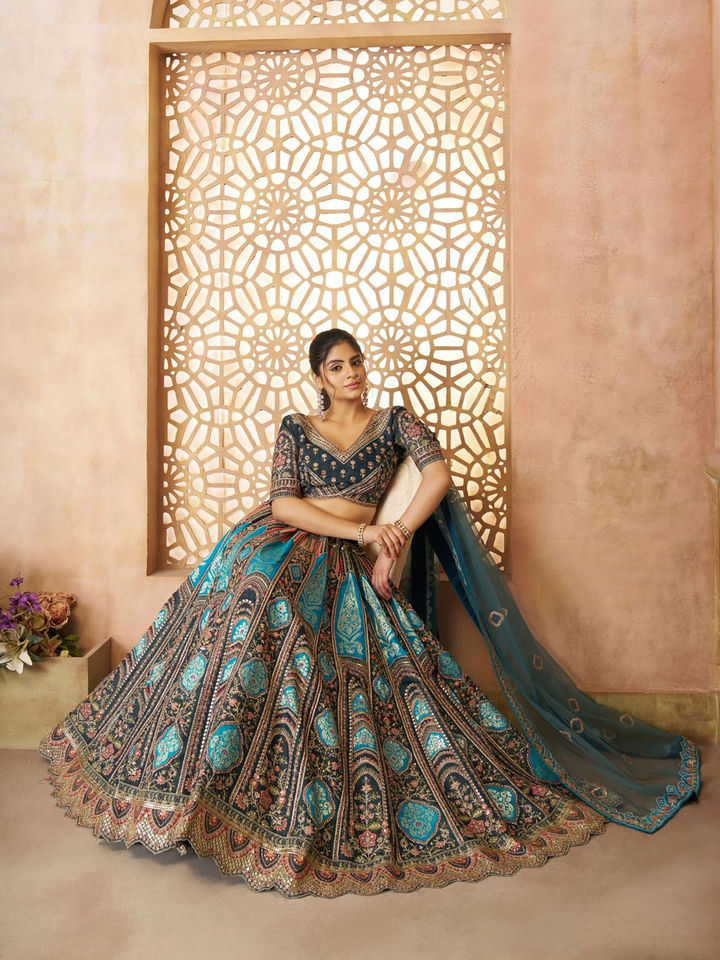 Make a grand statement with this exquisite teal blue and brown semi-stitched lehenga set, beautifully adorned with intricate embroidery and traditional motifs. Crafted from premium silk-blend fabric, the lehenga showcases detailed thread and zari work with floral and geometric patterns, perfectly balanced with a shimmering border. The matching embroidered blouse enhances the regal charm, while the soft net dupatta with elegant detailing completes the luxurious ensemble. Perfect for weddings, receptions, and festive occasions, this lehenga brings together heritage craftsmanship and modern grace.